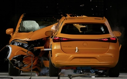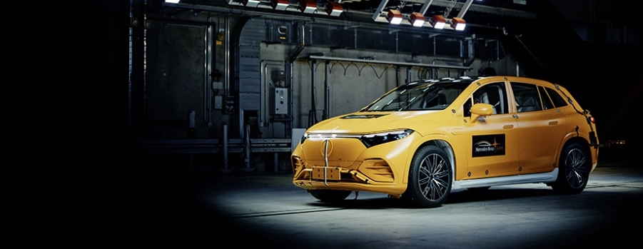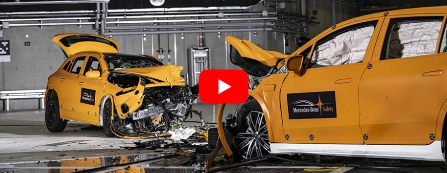 Mercedes-Benz ha condotto il primo crash test pubblico al mondo coinvolgendo due veicoli 100% elettrici, superando i requisiti legali e del settore delle valutazioni. Invece di seguire le specifiche di Euro NCAP, che prevedono una collisione frontale a 50 km/h tra un veicolo di prova e un carrello, Mercedes-Benz ha utilizzato due veicoli reali (EQA e SUV EQS) che erano più pesanti e più veloci, con una collisione a 56 km/h. Questo ha creato un impatto molto più potente.
