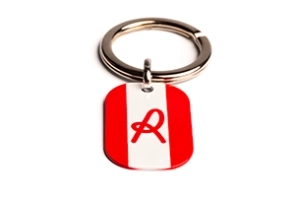Un portachiavi in bronzo con targa "R" smaltata